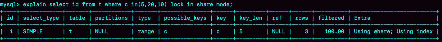 可以看到,这条in语句使用了索引c并且rows=3,说明这三个值都是通过B+树搜索定位的。
