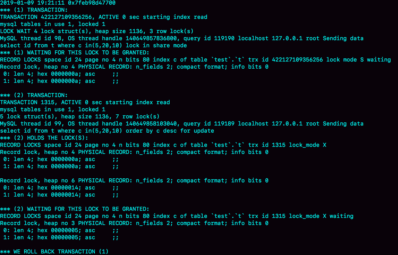 图3是在出现死锁后,执行show engine innodb status命令得到的部分输出。这个命令会输出很多信息,有一节LATESTDETECTED DEADLOCK,就是记录的最后一次死锁信息。