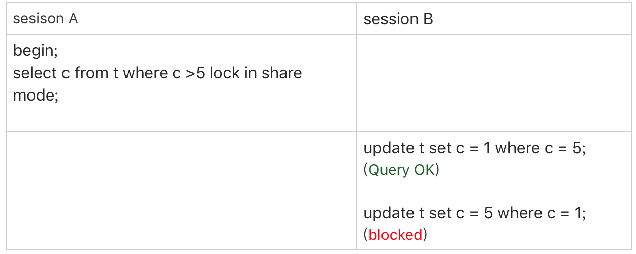 gaotuan[test]11:02:07>select c from t where c>5 lock in share mode;