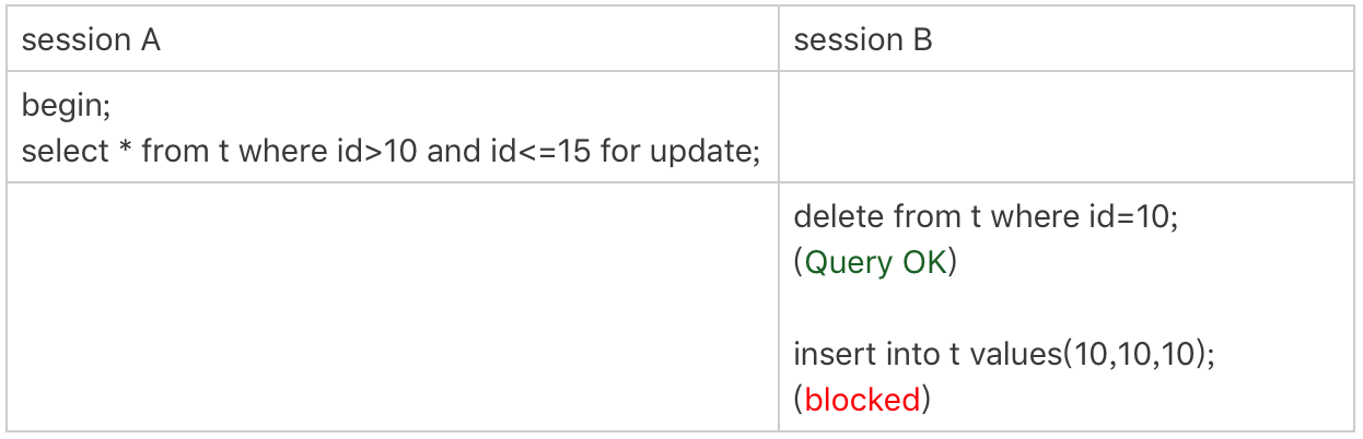 而这个例子select * from t where id>10 and id<=15 for update中,最右边加的是(15,20]的next-key锁,