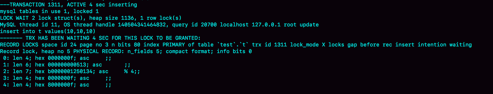 - WAITING FOR THIS LOCK TO BE GRANTED,表示的是这个事务在等待的锁信息;